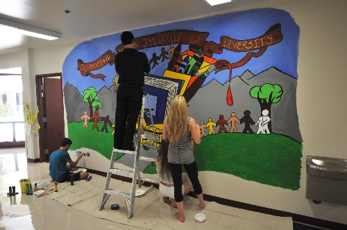 City National Bank employees volunteered Aug. 18 to paint the mural, designed by Bishop Gorman High School junior Zach Telles. City National Bank has sponsored Jydstrup for the past decade, donating school supplies and other items when the school needs help, said principal David Frydman.
