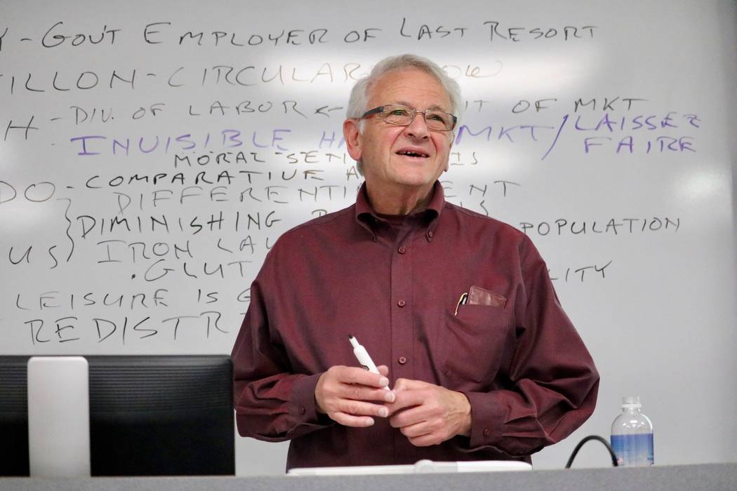 In one of his final classes at UNLV, the history of economic thought, Malamud chronicled the names of famous economists and their most well-known contributions. It’s one of his favorite classes.