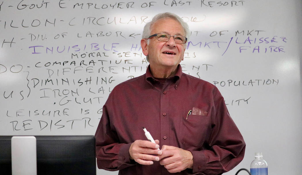 In one of his final classes at UNLV, the history of economic thought, Malamud chronicled the names of famous economists and their most well-known contributions. It’s one of his favorite classes.
