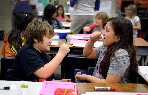 Students raise their hands high. And it's not just a couple of overachievers. Just about everyone stretches an arm straight up, as if trying to graze their fingers against the ceiling.