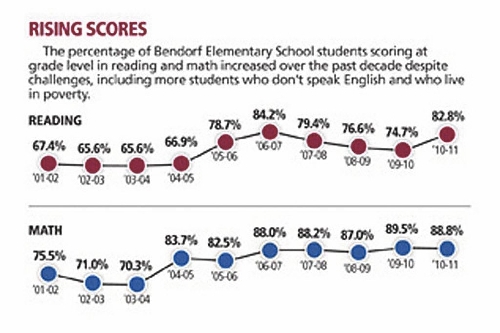 Oddly enough, Bendorf's students actually were doing worse a decade ago when the mostly Caucasian and middle- to upper-class students were statistically favored to outperform. About 14 percent fewer students were at grade level then.