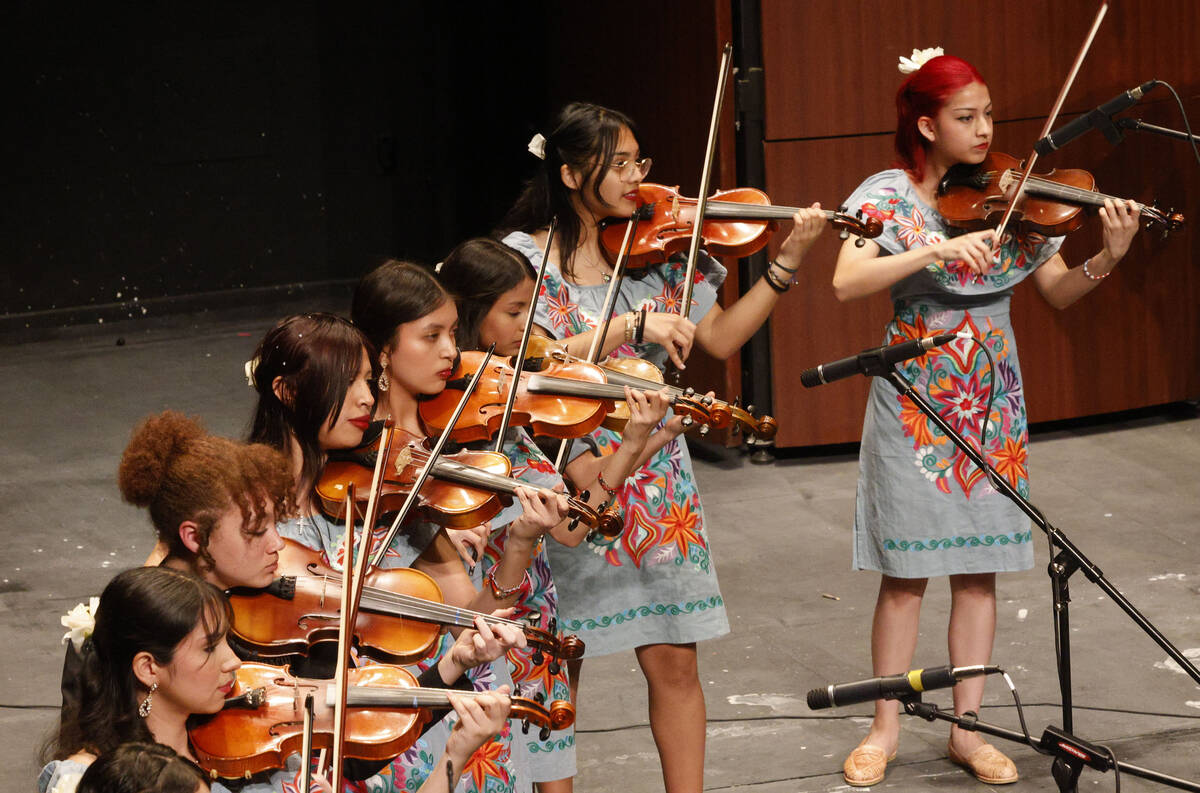 They look for the signal from their section leader, Alondra Bernal, a 17-year-old senior. With her violin under her chin and bow in hand, Bernal lifts the bow up and down, signaling the entire group to play.
