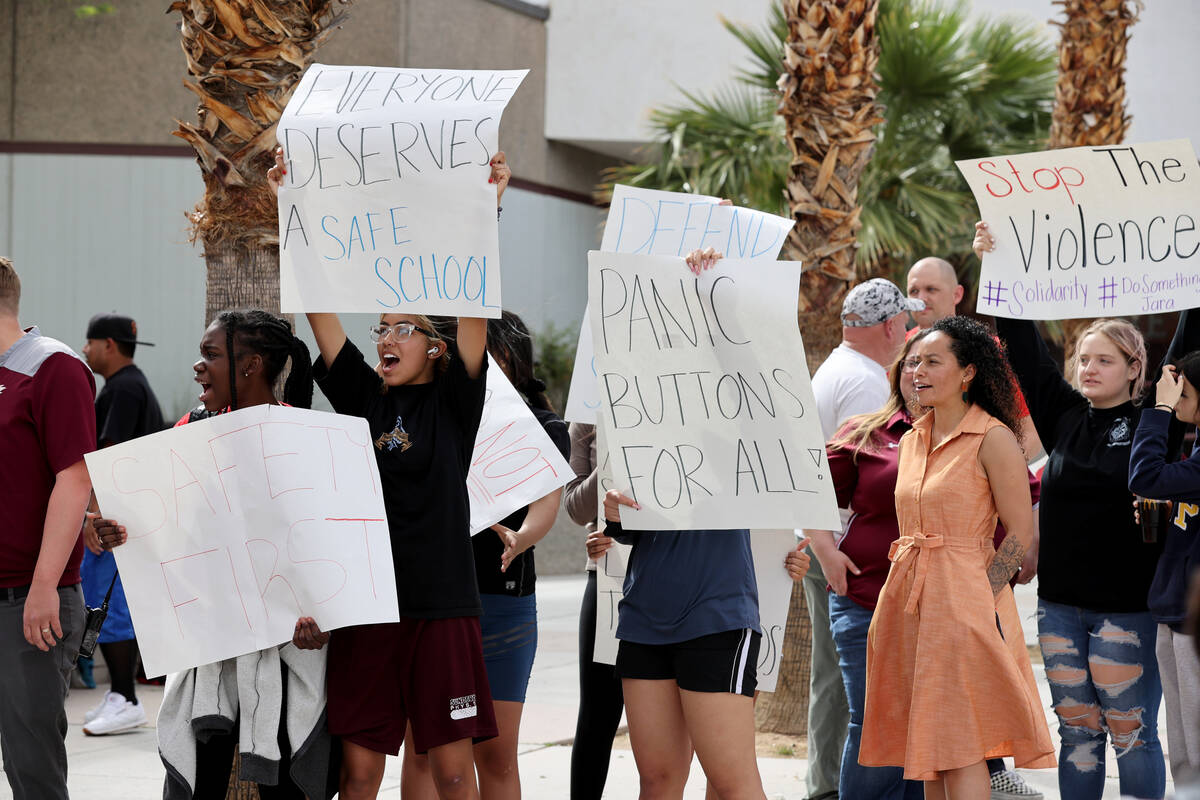 Two dozen students, teachers and support employees in the Clark County School District rallied at Eldorado High School on Tuesday to call for more accountability from the district about safety protocols they say were not implemented as the school returned for its first day of classes following the violent assault of a teacher on campus earlier this month.