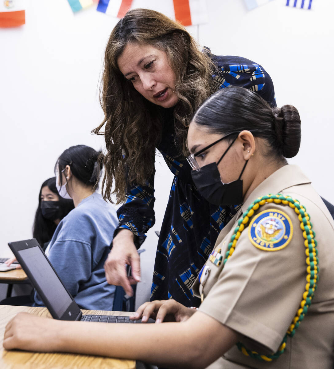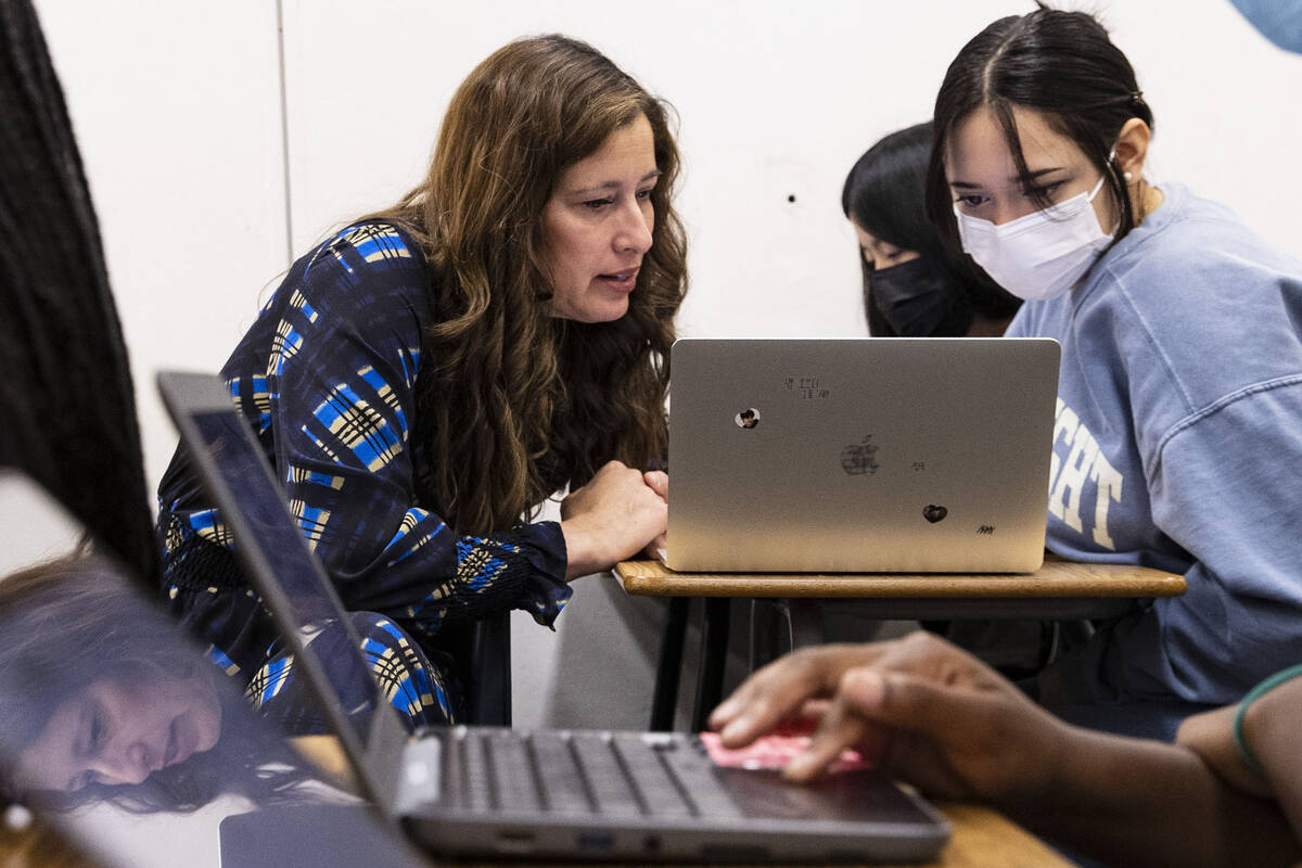 In a Spanish-language classroom decorated with colorful papel picado, traditional paper cutouts that are commonly hung for celebrations in Spanish-speaking countries, Nevada’s Lt. Gov. Lisa Cano Burkhead is helping students with their classwork.