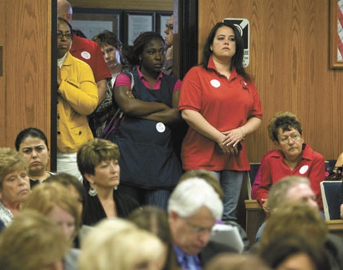 Because of an overflow crowd of about 300 people, about 100 people, including many union members, were forced to gather in the hallway and lobby outside the Greer Education Center auditorium, on Flamingo Road near Eastern Avenue.