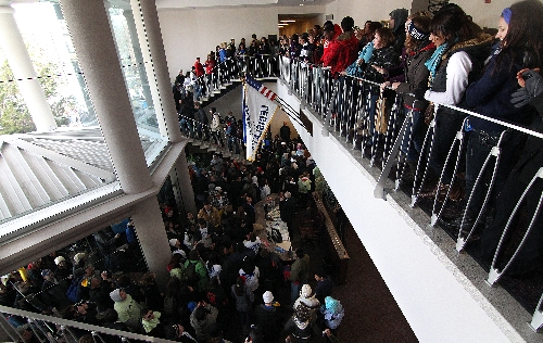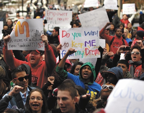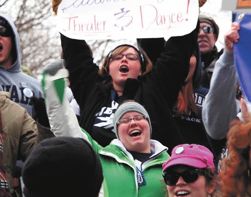 CARSON CITY -- Nearly 1,000 college students from across the state rallied in the snow in front of the Capitol and Legislative Building on Monday to protest Gov. Brian Sandoval's plan to cut state support to higher education by more than $160 million.