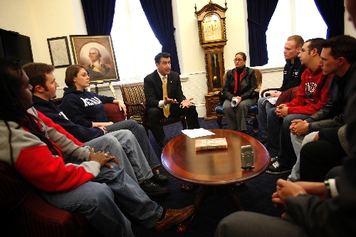 "This is a tough time," Sandoval told nine student leaders he met with in his office. "There are companies that have laid off hundreds of workers. With new taxes, they might not stay in business."