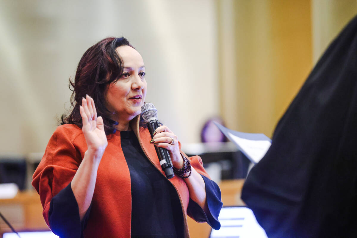 After Esparza-Stoffregan — the first new trustee to be sworn in — was done taking the oath of office, Garcia Morales asked her to take her seat at the dais.