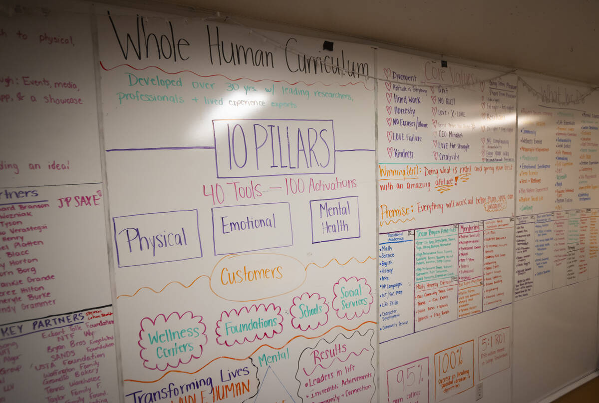 A series of whiteboards dominate an entire wall, covered in multi-colored lettering that spells out the nonprofit organization’s goals, values, schedule of events and more — a whole lot more.