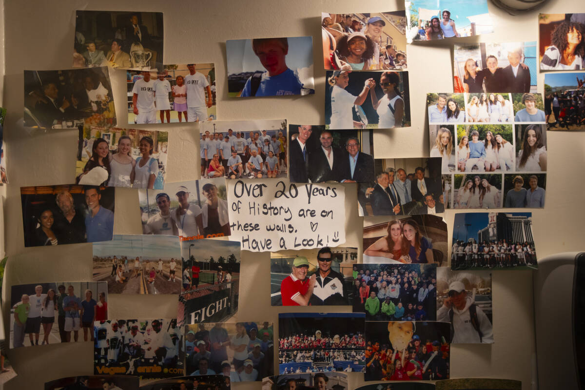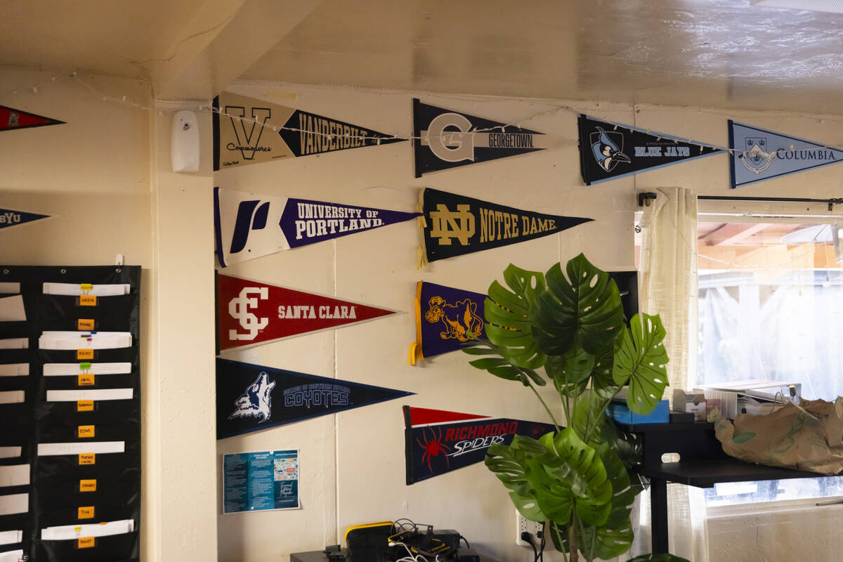 All across the wall they hang, an array of college pennants bearing the insignias of exclusivity.