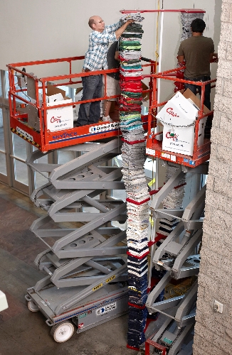 UNLV alumnus Troy Gillett created two winding columns of about 5,000 shirts measuring 31 feet tall.