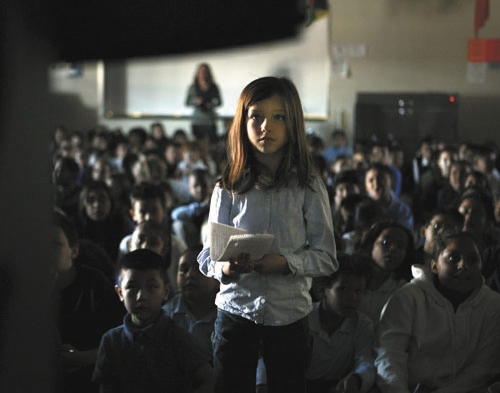 The students all twist their heads to the right to look out the cafeteria windows. "It's not raining," some students reply as teachers laugh.