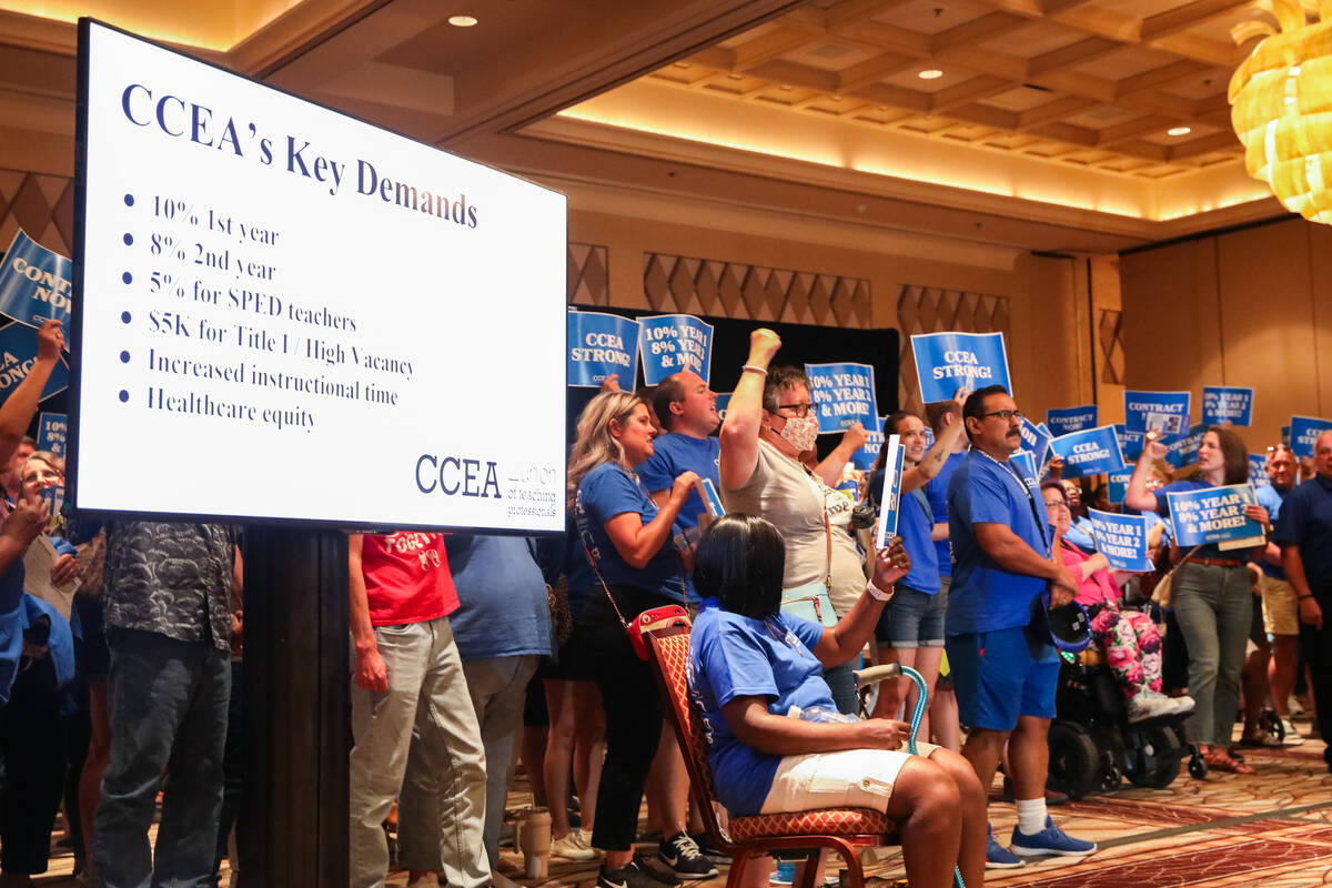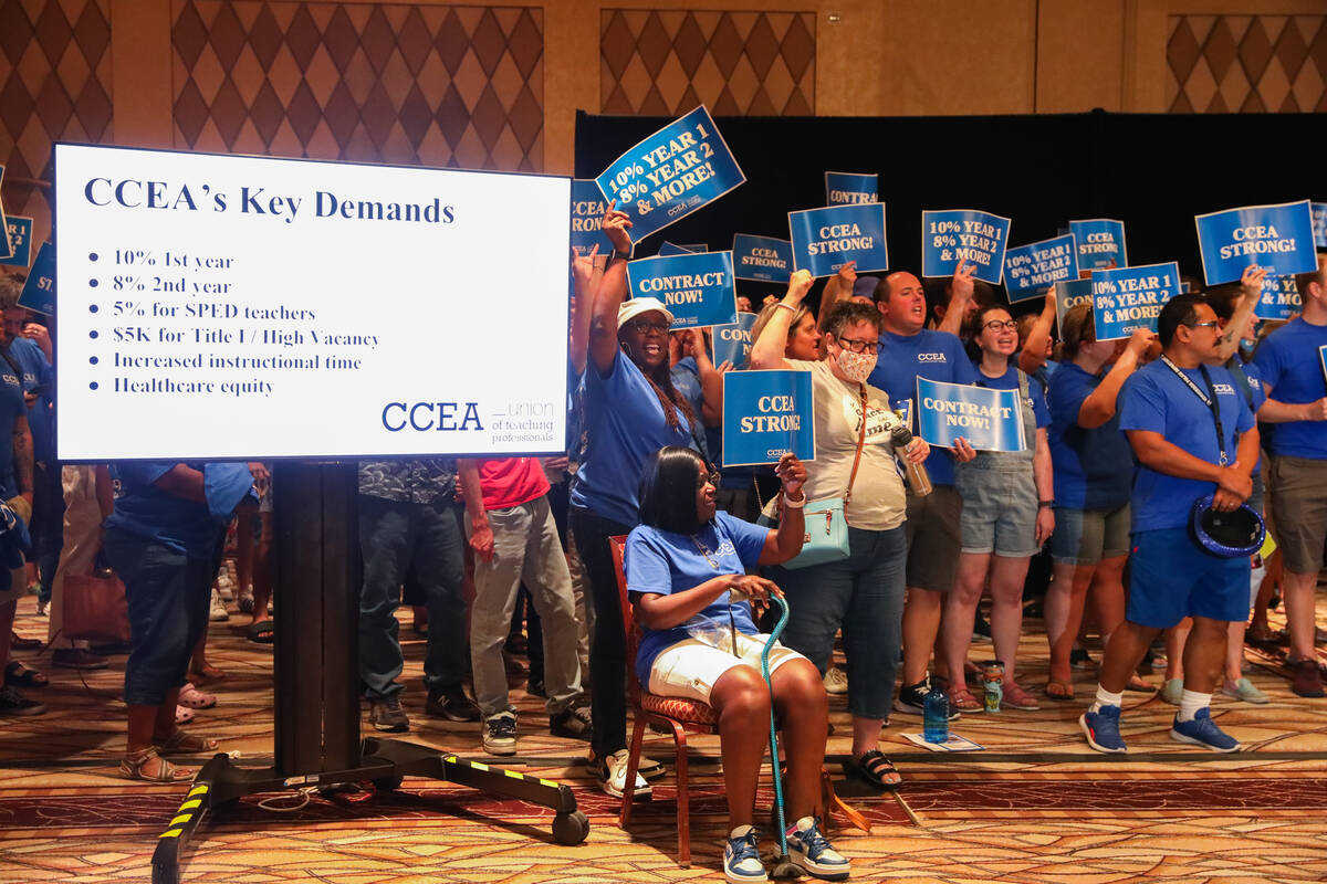 Thousands of teachers filled a Rio convention center Saturday as the Clark County Education Association decided to consider walkouts at certain schools if the district administration fails to approve pay raises in a new union contract by Aug. 26.