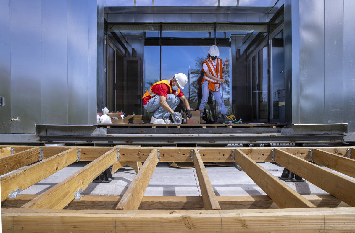 Student Jorge Medina, left, begins to assemble parts for a deck soon to be installed as a UNLV team readies to compete next week in the U.S. Department of Energy’s Solar Decathlon Build Challenge on Friday, April 9, 2021. They are working to complete their project "Mojave Bloom," a 628-square-foot home they’ve built from scratch, currently at the Las Vegas Healing Garden. L.E. Baskow/Las Vegas Review-Journal) @Left_Eye_Images