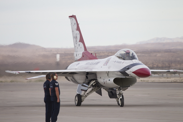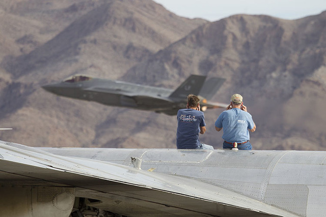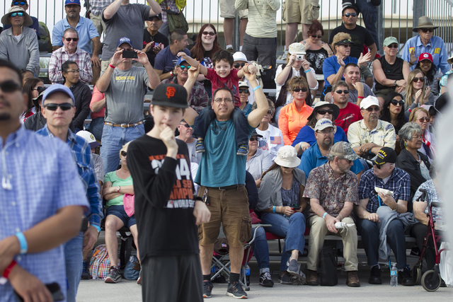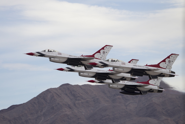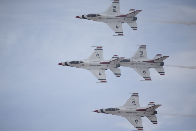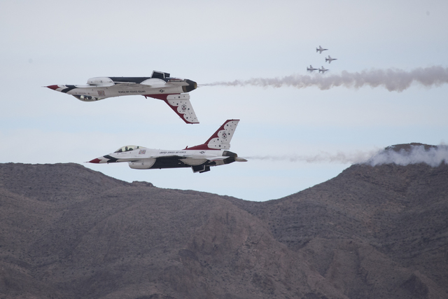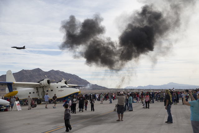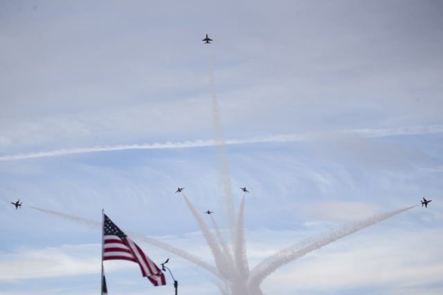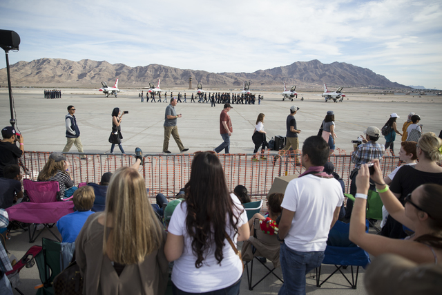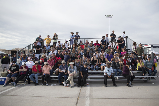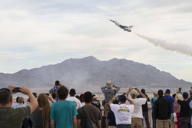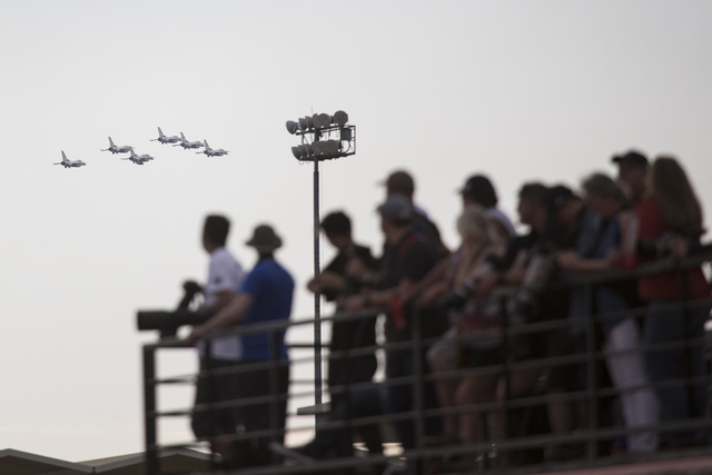 Nellis officials estimates at least 135,000 watched Saturday’s free show after parking for 75,000 vehicles at Las Vegas Motor Speedway for shuttle bus service reached capacity at 12:45 p.m.