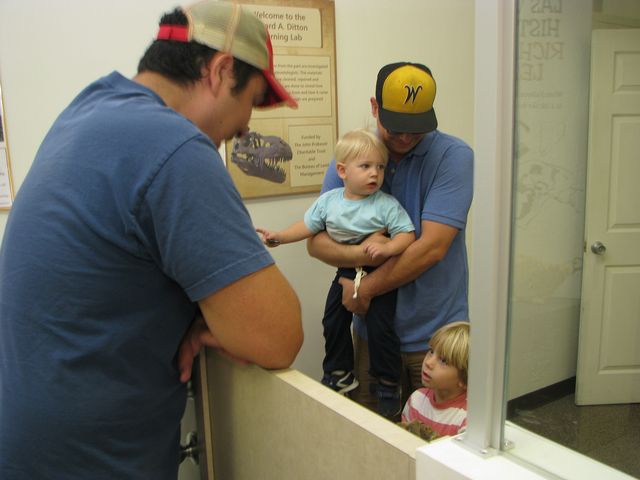 The Harpers and Bonde were in the Richard Ditton Learning Lab, a 1,200 square-foot space that was recently converted into a working laboratory at the museum. A half wall topped with some plexiglass divides student volunteers from the public, but a set of steps along the wall allows young children to watch the cleaning and conservation of ancient fossils from Nevada.