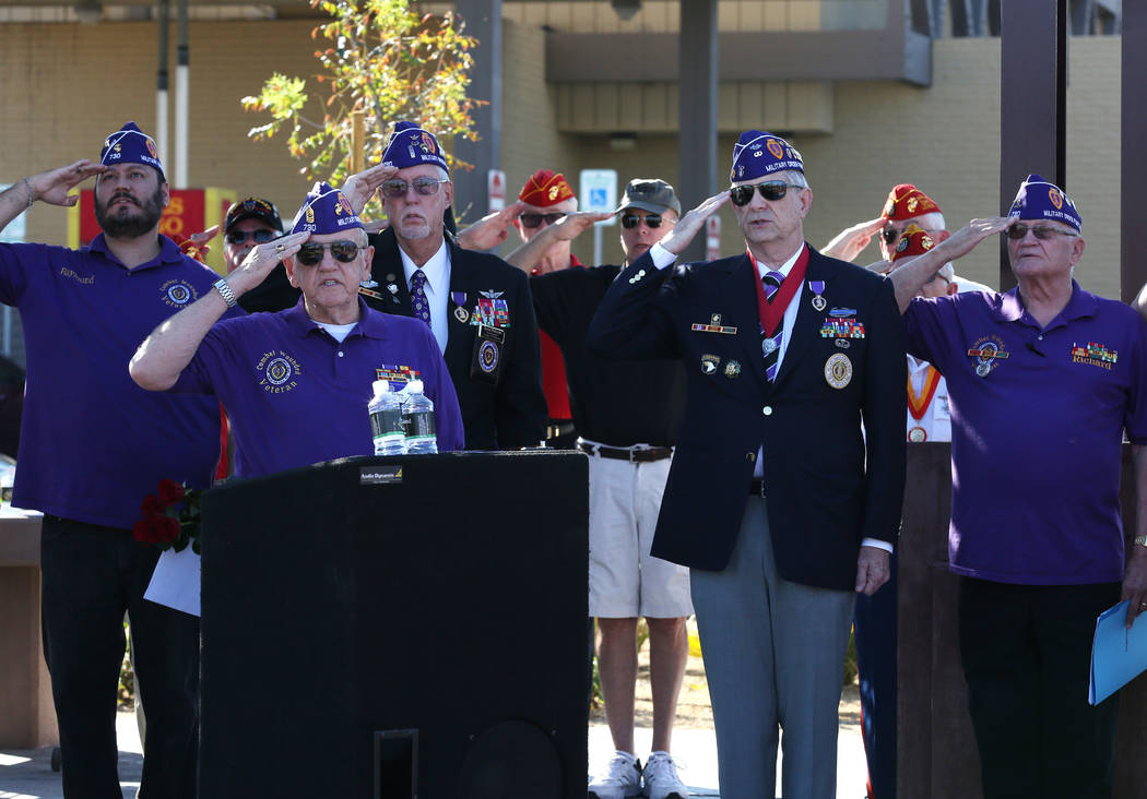 Members of Chapter 730 Military of the Purple Heart, including retired U.S. Army veteran David Hugus, second right, salute during the official opening of Purple Heart Plaza at 101 Market St. in downtown Henderson on Tuesday, Aug. 7, 2018. (Bizuayehu Tesfaye/Las Vegas Review-Journal) @bizutesfaye