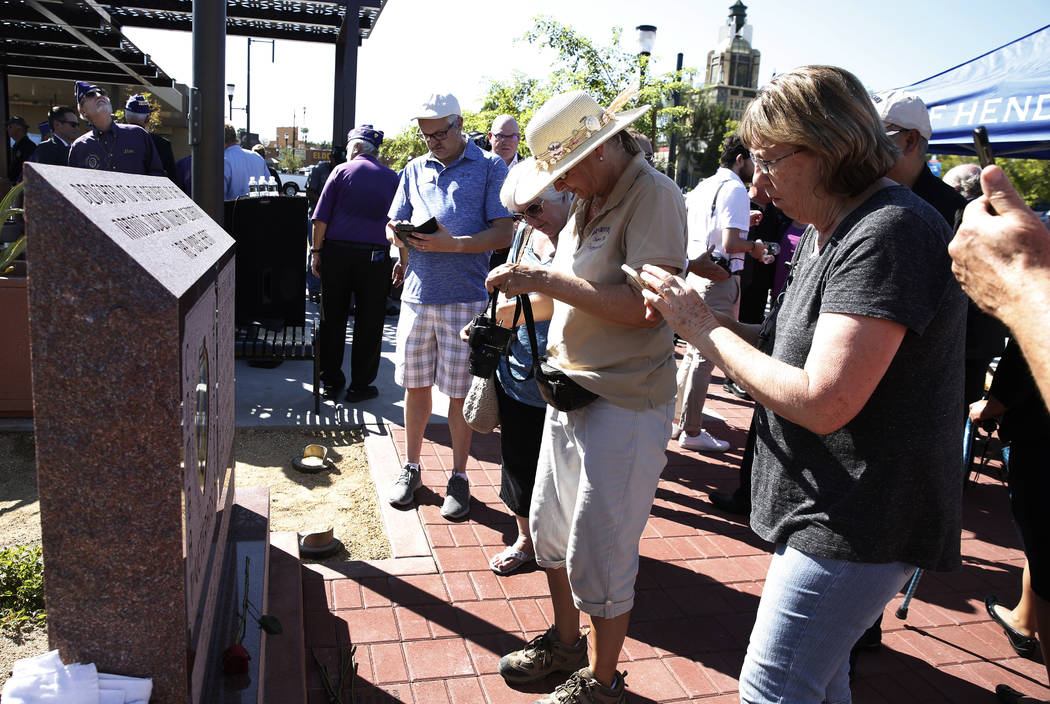 Diane Holman, right, and Dianne Robbins, both of Henderson, take a picture of Purple Heart Monument during the official opening of Purple Heart Plaza at 101 Market St. in downtown Henderson on Tuesday, Aug. 7, 2018. (Bizuayehu Tesfaye/Las Vegas Review-Journal) @bizutesfaye