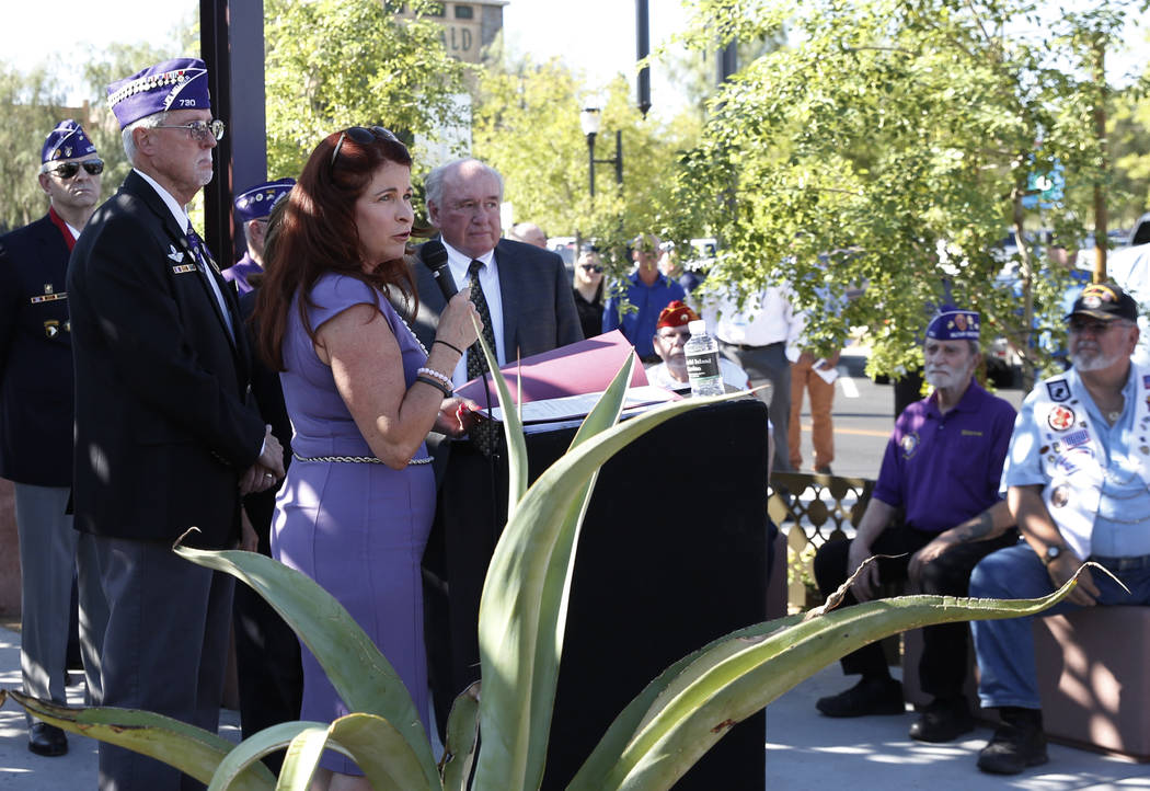 Henderson Mayor Debra March speaks during the official opening of Purple Heart Plaza at 101 Market St. in downtown Henderson on Tuesday, Aug. 7, 2018. (Bizuayehu Tesfaye/Las Vegas Review-Journal) @bizutesfaye