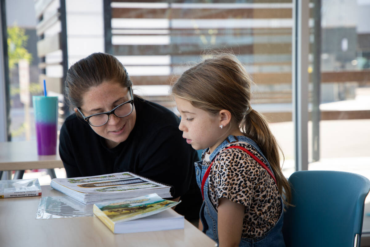 Leanne Pinault helps her daughter Presley, 8, with vocabulary lessons in the new West Henderson Library branch on Tuesday, Sept. 20, 2022, in West Henderson. (Amaya Edwards/Las Vegas Review-Journal) @amayaedw5