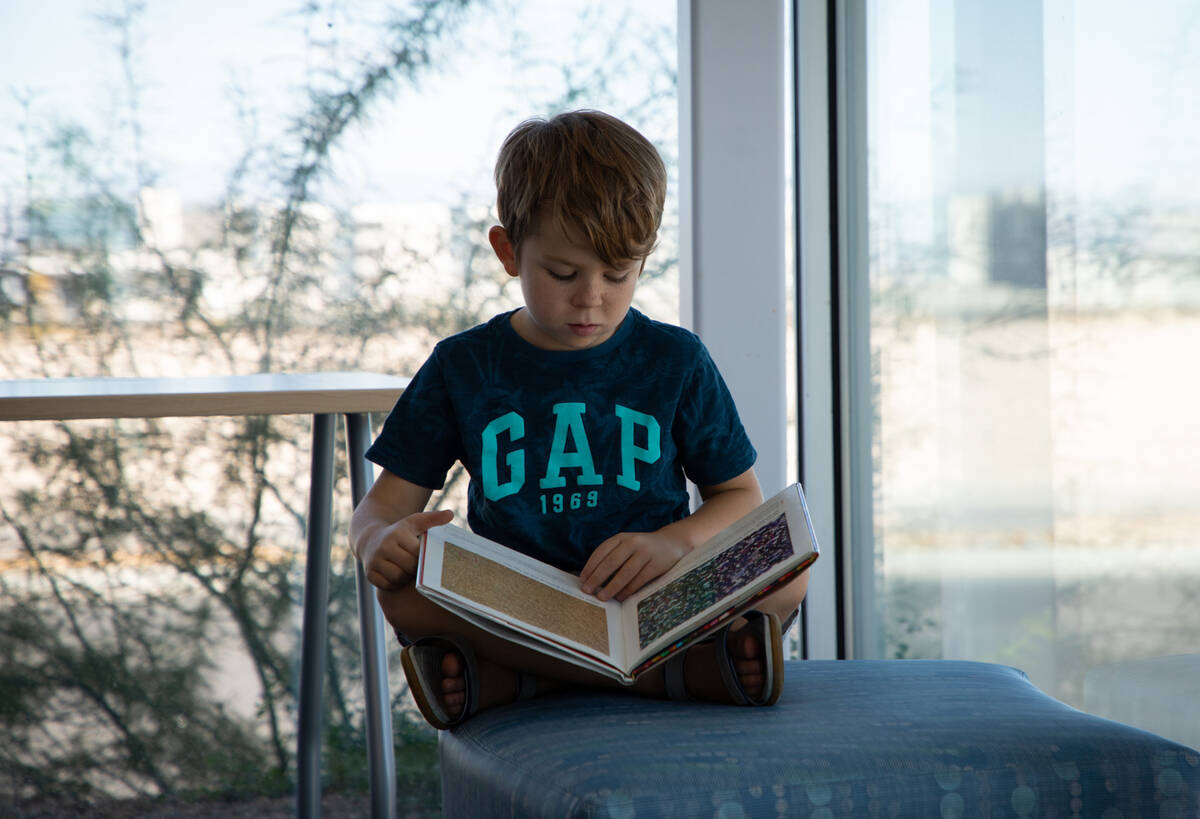 Parker Pinault, 7, reads at the grand opening of the West Henderson Library branch on Tuesday, Sept. 20, 2022, in West Henderson. (Amaya Edwards/Las Vegas Review-Journal) @amayaedw5