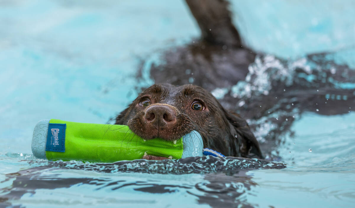 A dog retrieves a toy during Dog Daze of Summer event where dogs swim in the pool before it closes for the season at Desert Breeze Aquatic Facility on Saturday, Sept. 10, 2022, in Las Vegas. (L.E. Baskow/Las Vegas Review-Journal) @Left_Eye_Images