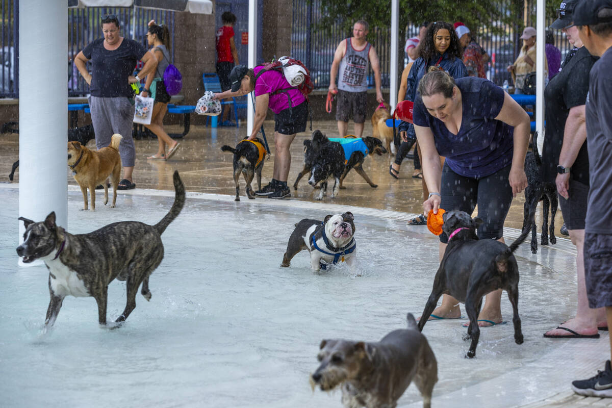 Dogs run through the shallows during Dog Daze of Summer event where dogs swim in the pool before it closes for the season at Desert Breeze Aquatic Facility on Saturday, Sept. 10, 2022, in Las Vegas. (L.E. Baskow/Las Vegas Review-Journal) @Left_Eye_Images