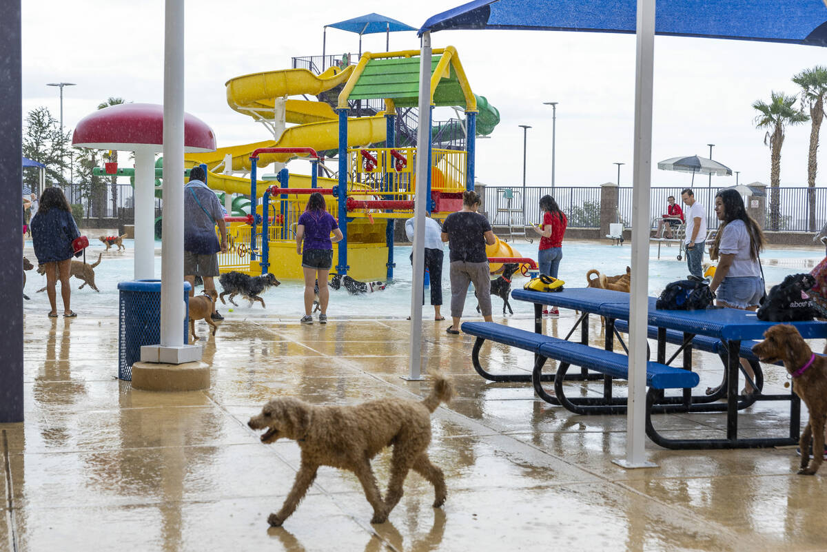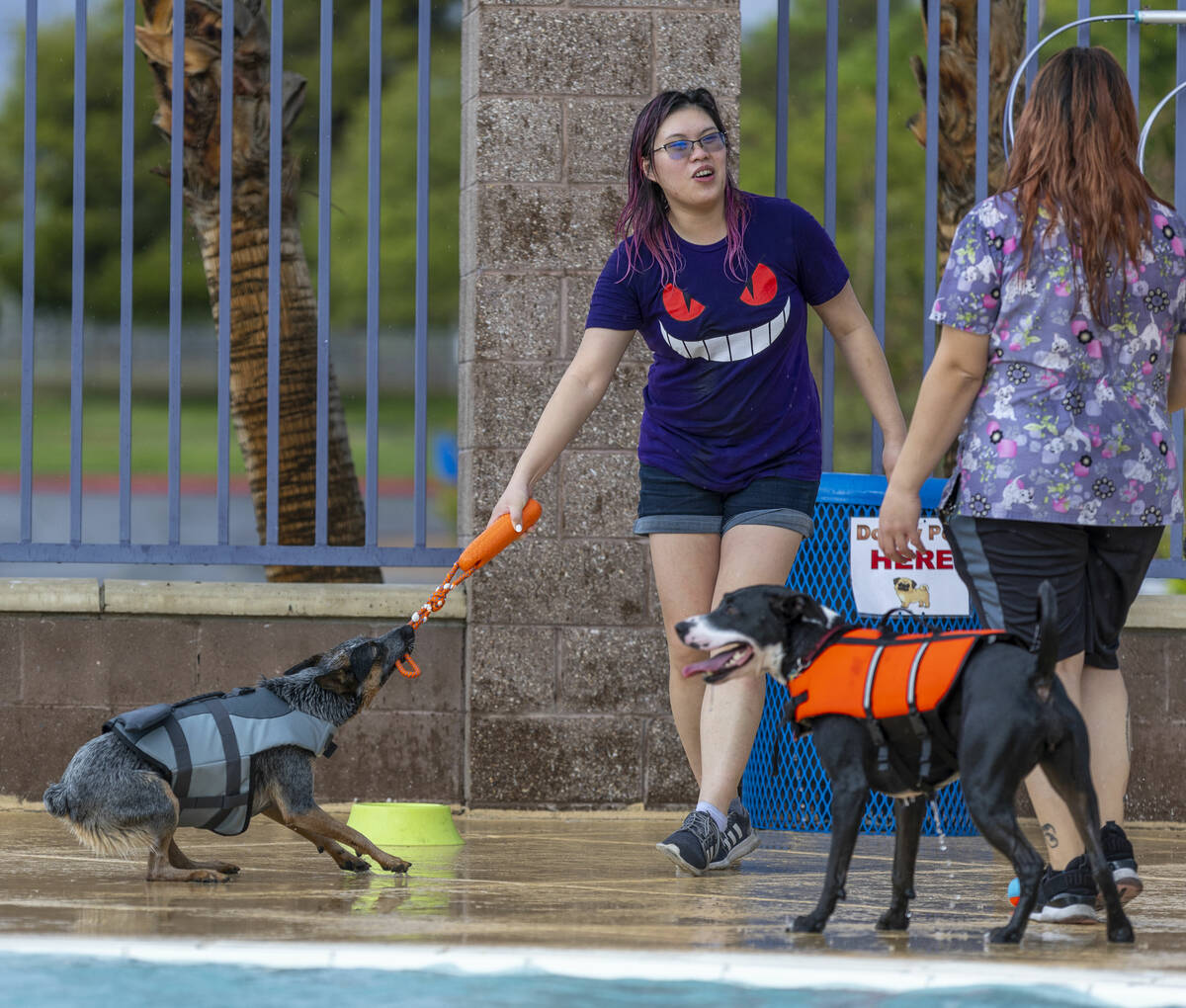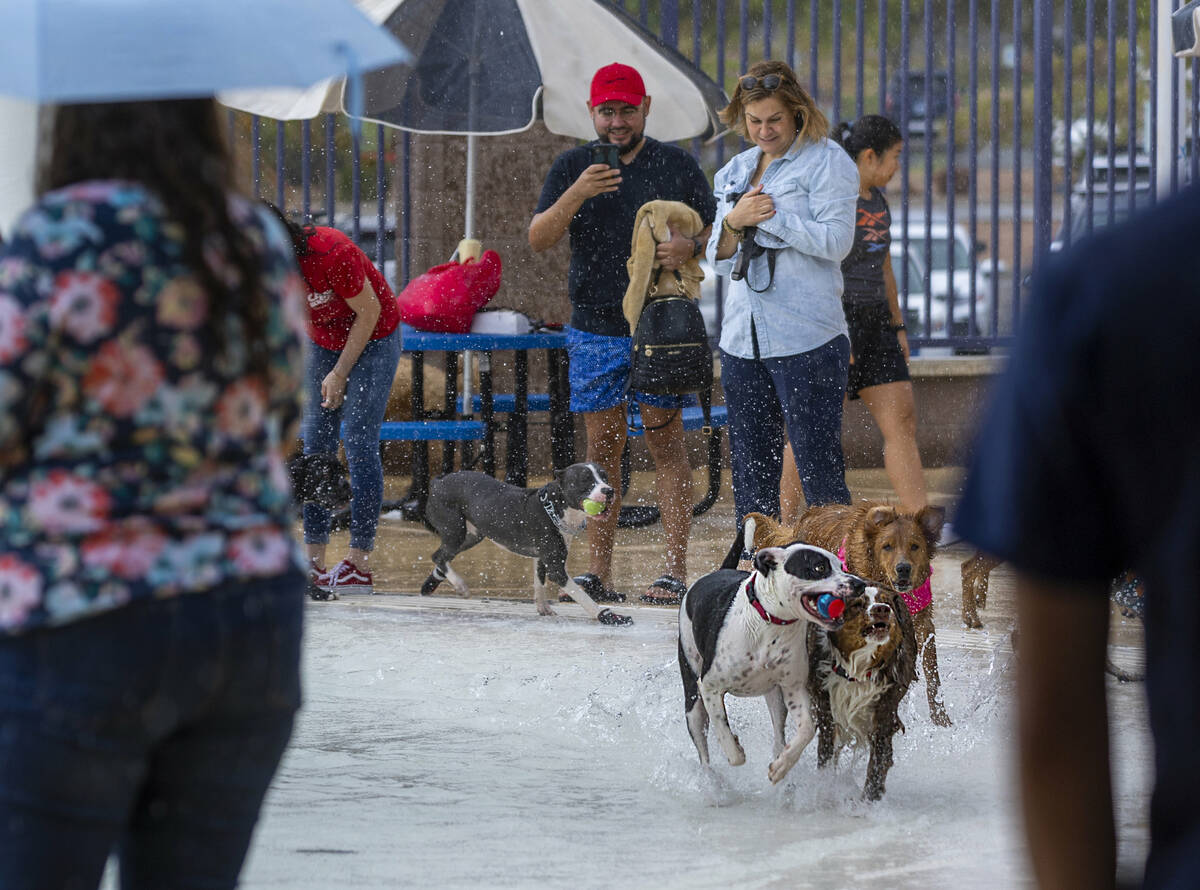 The rain can’t stop the Dog Daze of Summer event where dogs swim in the pool before it closes for the season at Desert Breeze Aquatic Facility on Saturday, Sept. 10, 2022, in Las Vegas. (L.E. Baskow/Las Vegas Review-Journal) @Left_Eye_Images