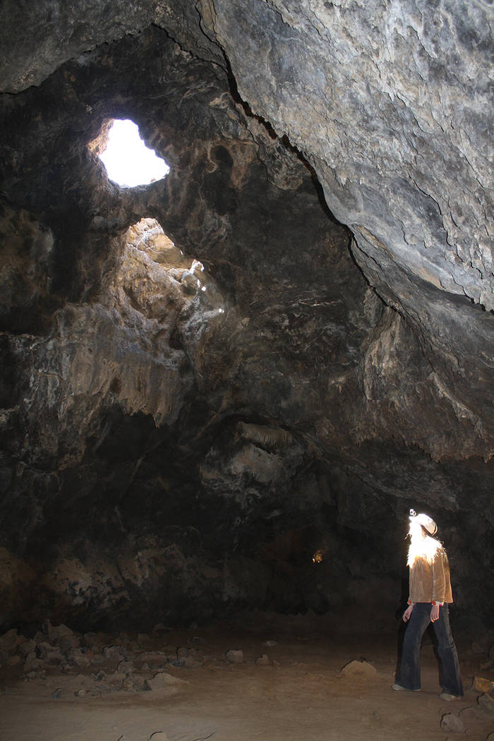 Enter the lava tube by taking the metal stairs. At the bottom of the stairs, go left into the tube. Terrain initially is rocky, with uneven footing. Although it appears you can’t go very far, you’ll see the way if you look closer. Just duck way down and crawl through the opening — watch your head — and you will emerge into the lava tube itself, where there is plenty of room to stand and walk around, on a relatively flat floor. There are a few small holes in the top, 15-20 feet above you, that provide some light.