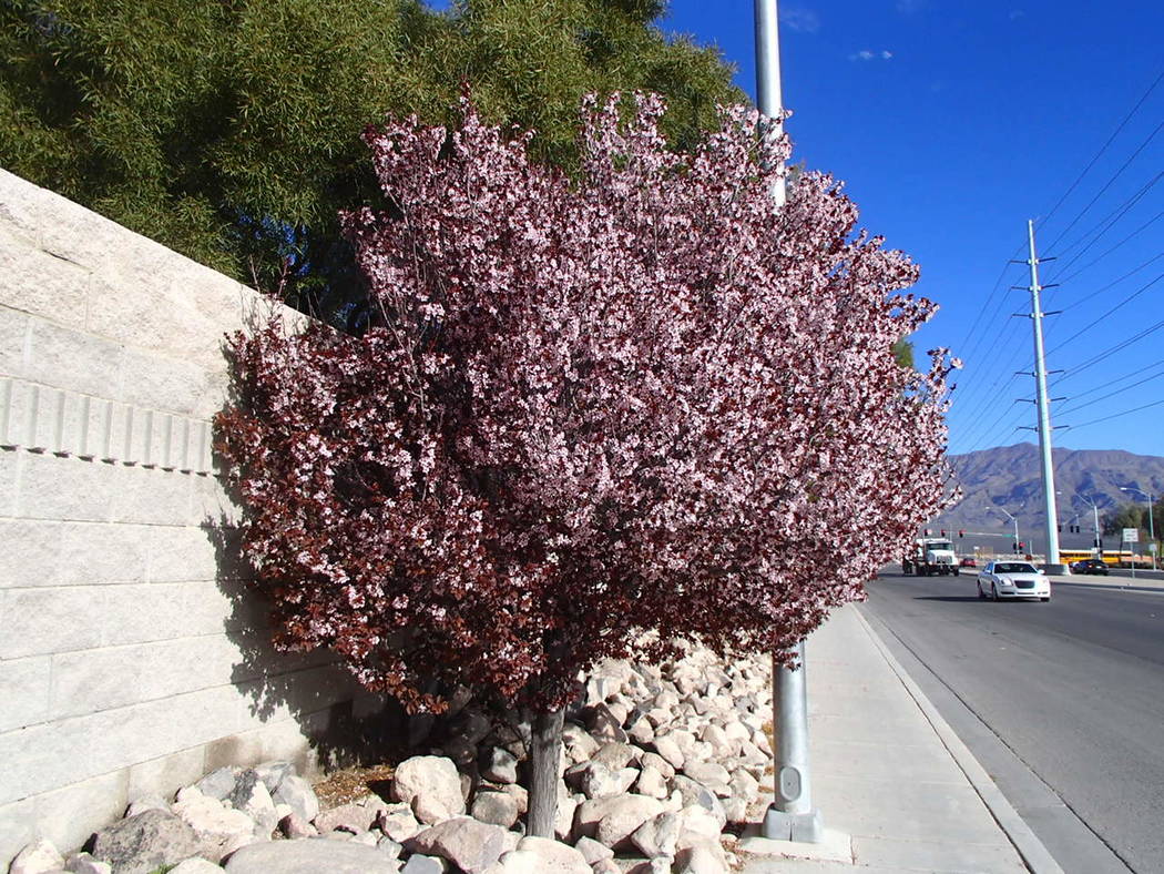A: The ornamental purple leaf plums were selected for their leaf color and low fruit production, but they originally came out of the orchard industry. They became popular in landscaping for their ornamental beauty: beautiful spring flowers and purple leaf color. Some ornamental purple leaf plums leaf out green and then turn purple later. Others leaf out purple and stay that way.