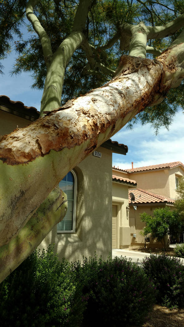 Q: I bought a home with a beautiful mature palo verde tree in the front yard. When I moved in, it was severely trimmed with one of the branches “scabbing.” I found no drill holes from insects. I wondered if this branch was sunburned as these trees have no bark. What do I do?