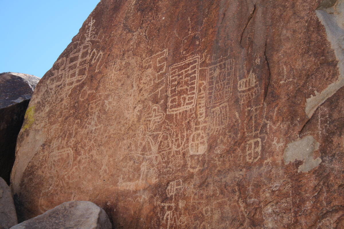 Just north of this canyon is towering, granite-covered Spirit Mountain, or Avi Kwa’ Ame, at 5,639 feet the highest peak in the Newberry Mountains. It is said to be the spiritual birthplace of the Mojave People and is important in the lore of all 12 Yuman-speaking people of the lower Colorado region. It is considered sacred ground and perhaps one reason why there are so many petroglyphs in Grapevine Canyon. The mountain itself and its immediate surroundings are on the National Register of Historic Places, and a movement is afoot to have the Biden administration place a larger surrounding region under federal protection as a national monument.