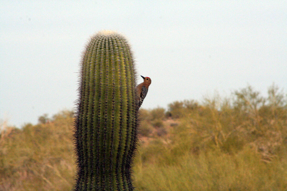 The saguaro is host to many avian species. The gilded flicker and Gila woodpecker make nest cavities in the fleshy interior, and once they abandon that space, elf owls, purple martins and finches often take over. Large birds such as Harris’ and red-tailed hawks sometimes build their nests among the cacti arms.
