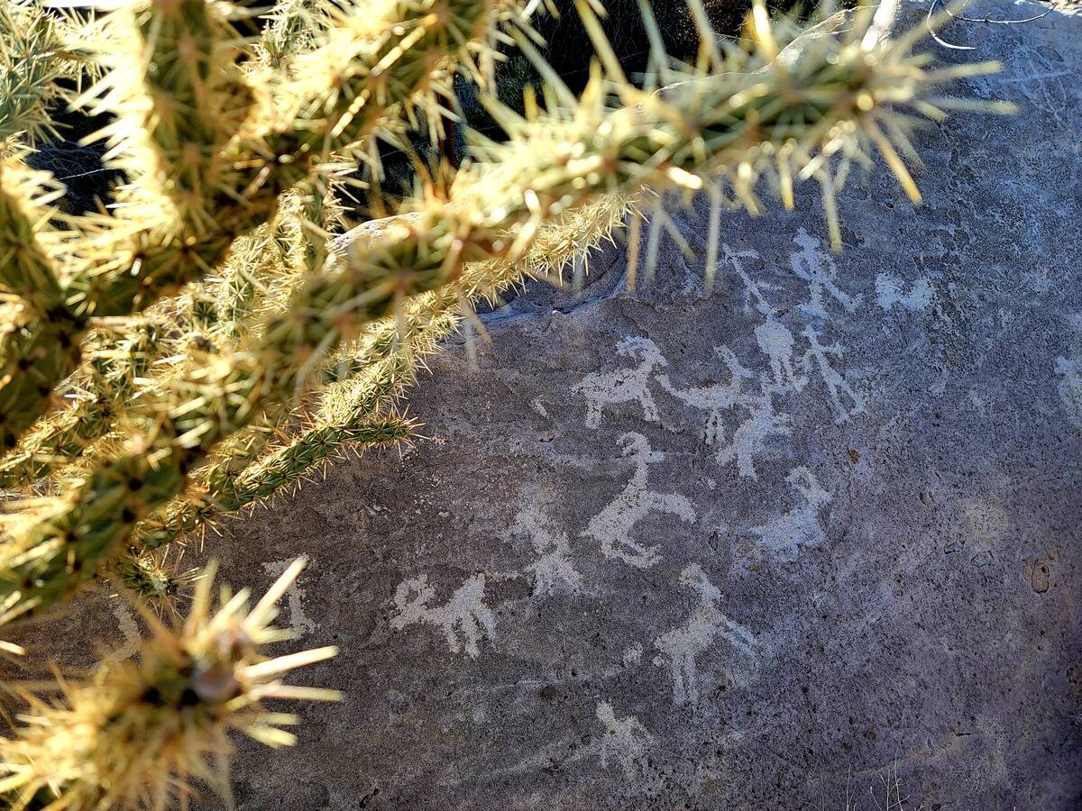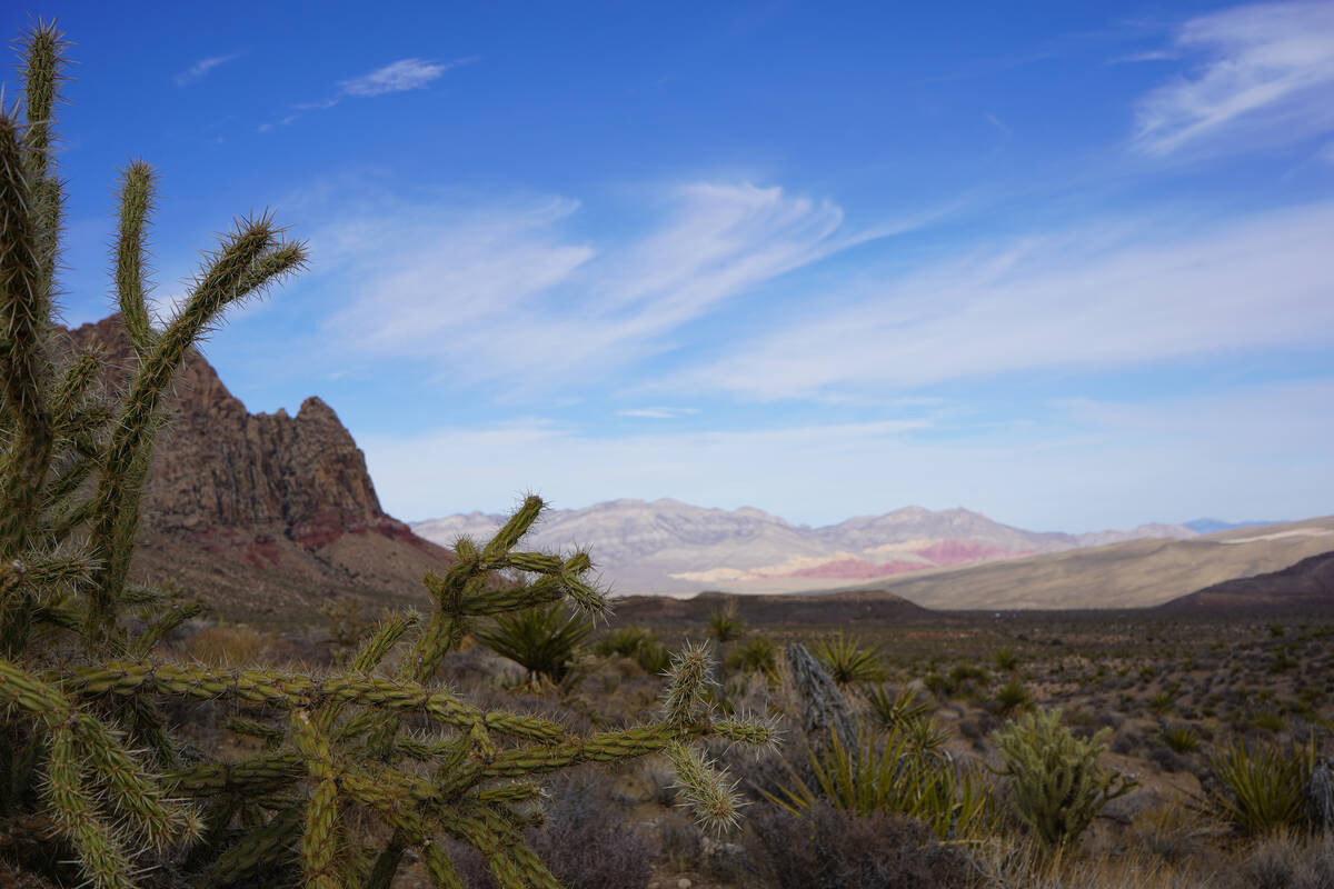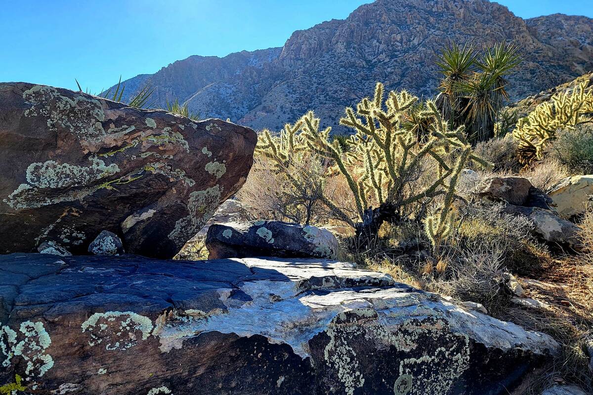 The payoffs can be grand. Bright blue skies contrasting a muted tapestry of desert beige, gray and sage green. Outstanding perspectives to watch clouds build dramatically. Giant reddish-brown conglomerate boulders that spark geologic curiosity about a time when ancient seas covered the landscape. Sunshine spinning gold through sheaths of the spines of thousands of buckhorn chollas. Sweeping views that include miles of towering sandstone cliffs and the Calico Hills far to the north, along Red Rock’s scenic loop. Petroglyphs of bighorn sheep near Lone Grapevine Spring. A chance to walk in a vast garden of hardy plants armed with spikes, spines and swords (Joshua trees, Mojave yuccas, buckhorn and pencil chollas and barrel and hedgehog cactus). A lucky trailside encounter with grazing wild burros. Spotting a boisterous flock of pinyon jays on a cool day. Clumps of snow sparkling on Joshua trees. Desert springs where water and shade attract critters, including migrating birds singing in spring. Early springtime glimpses of awakening lizards and snakes (ideally at a distance). Cactus flowers in yellow, fuchsia and burnt orange.