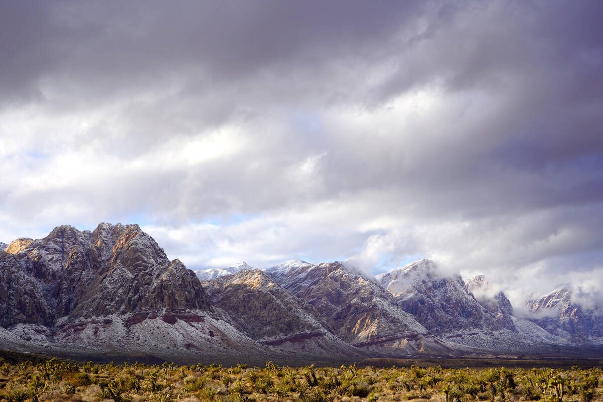 One approach to take with Late Night Trailhead and the area that’s officially called the Cottonwood Valley Trail System is to consider a first visit to be one of exploration and an investment in future hikes. There’s nothing like shoes on the dirt to gain an initial familiarity with a place. On our first visit, we faced the hill behind the latrines and then took a path to the right in pursuit of an unobstructed view of clouds spilling over the sandstone cliffs and peaks that form a fraction of the awe factor of Red Rock Canyon National Conservation Area. We kept track of the direction in which our car was parked by keeping an eye on the hill near the trailhead. There was guesswork involved, but we only hiked about 1½ miles out to take some photographs before retracing our steps back.