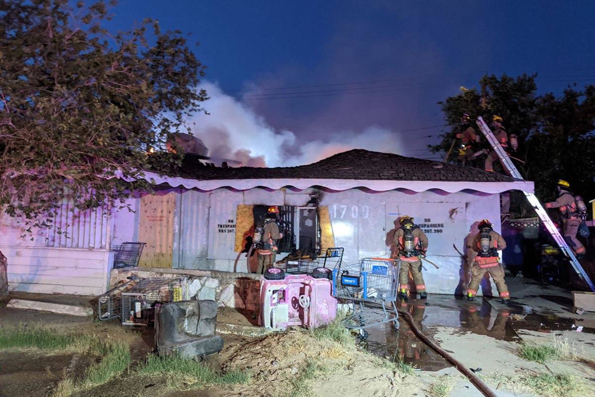 Firefighters begin inspection of a vacant house at 1700 Howard Dr. after flames were extinguished on Monday, May 4, 2020. One person was found deceased inside the house. (Las Vegas Fire Department)