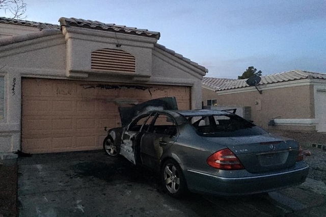 Crews responded about 4:30 a.m. Monday to a vehicle fire in the driveway of 8245 Cimarron Ridge Drive, near the intersection of Vegas and Durango drives, department spokesman Tim Szymanski said. The fire in the vehicle, a Mercedes, had began to spread to the garage and damaged the exterior of the house.
