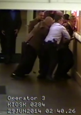 Men on each side of him then grab his arms and slam him up against the wall on his left before tackling him on the floor.