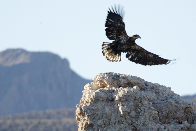 The Overton Arm at the north end of Lake Mead, for example, usually attracts more than 40 bald eagles to hunt for fish in the mammoth reservoir that holds an assortment of delights, from rainbow trout and striped bass to carp, largemouth bass and two kinds of shad. Eagles also sometimes pounce on a wayward coot or grebe or snatch some of the many green-winged teal or mallards that flock to the lake in the winter. They also eat small mammals.