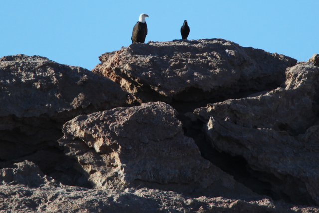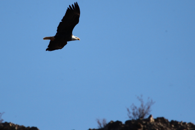 Peering through binoculars, Bob Haber watches in awe as a large dark bird with a snow-white head soars high above Lake Mead’s rocky shoreline.