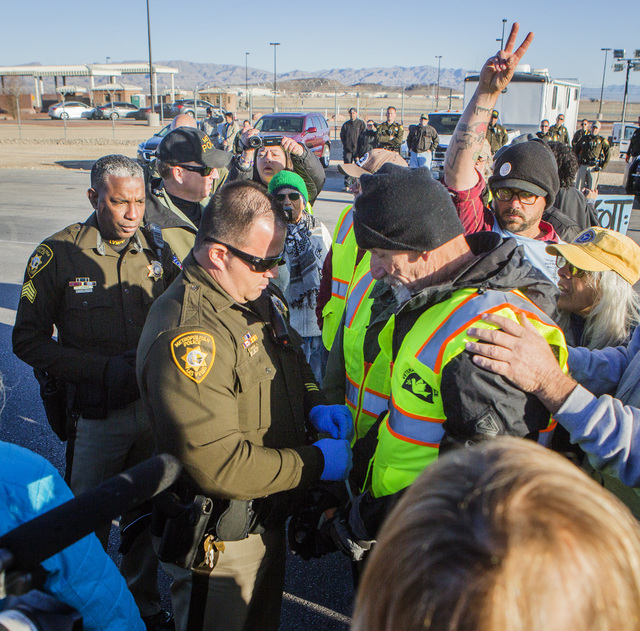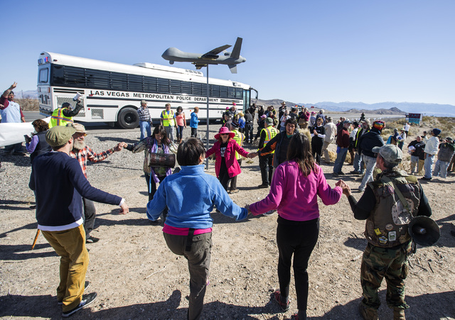In all, 34 men, women and two juveniles were arrested in four waves of civil disobedience actions near base entrances. They were cited and released on state misdemeanor charges of trespassing or pedestrian in the roadway. One person was arrested on an outstanding warrant, according to Las Vegas police.