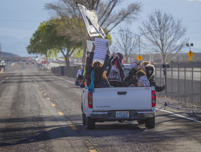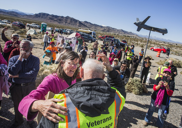 “I believe our military has our country’s best interest at mind, and this program is helping to keep our families safe, our country safe. That’s what it amounts to,” Frank said as protesters walked from their makeshift Camp Justice across U.S. Highway 95 to a Creech base access road.