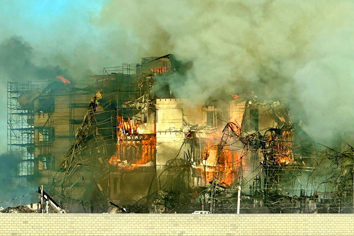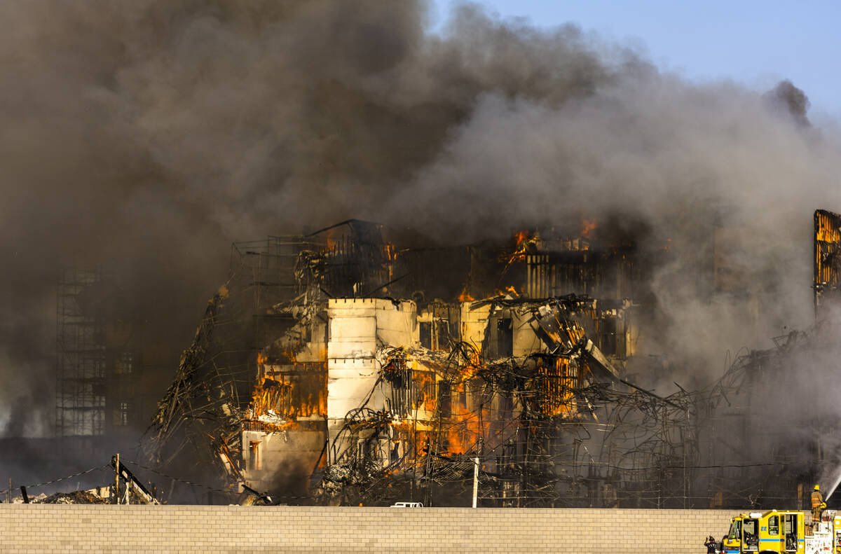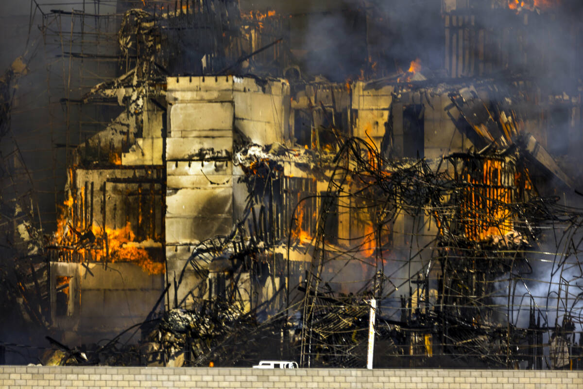 As of Wednesday morning, the fire was still smoldering, with smoke visible for miles. Several emergency vehicles patrolled the area around the collapsed structure.