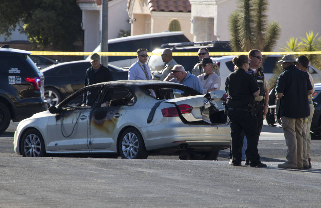 Police said the vehicle that burned matched the description of a vehicle used in a robbery on the 2200 block of North Rainbow Boulevard. Detectives are investigating whether the robbery and the homicide are connected.