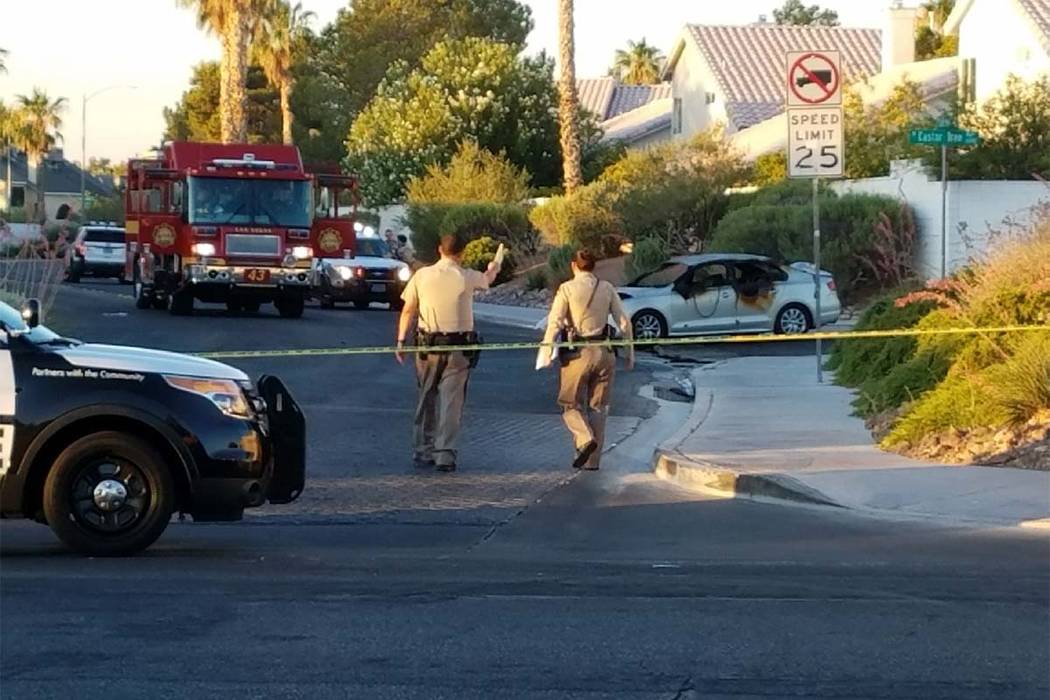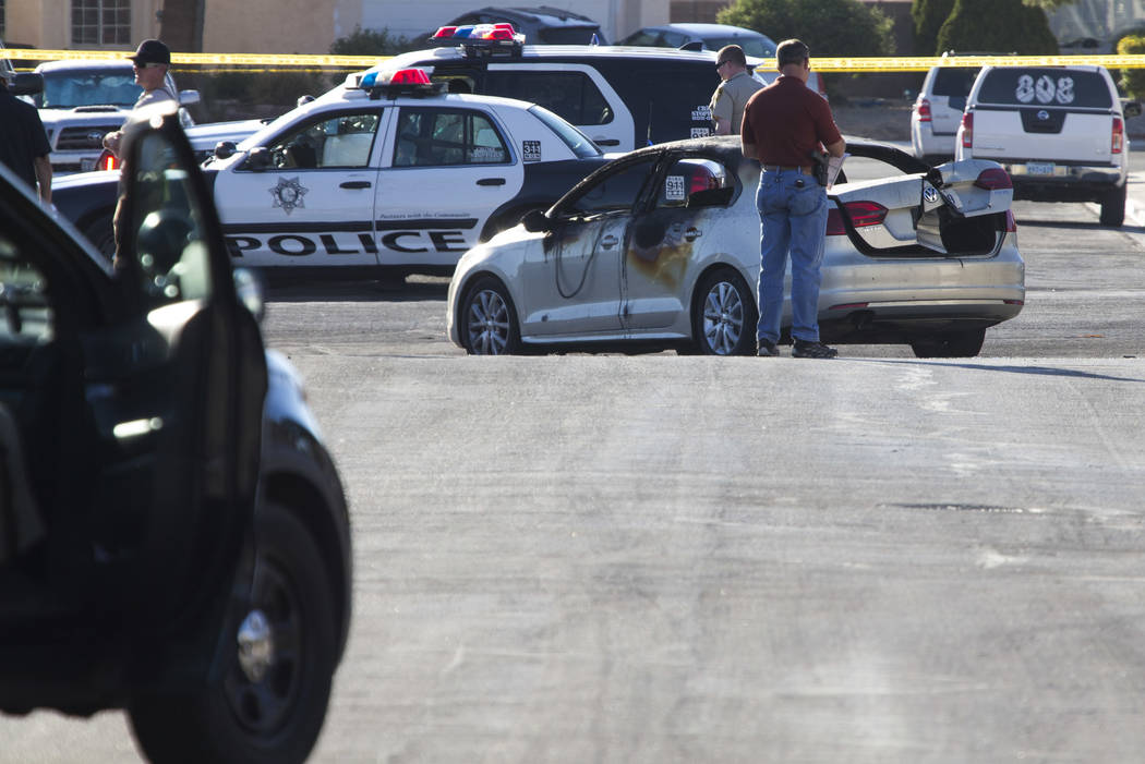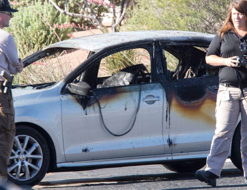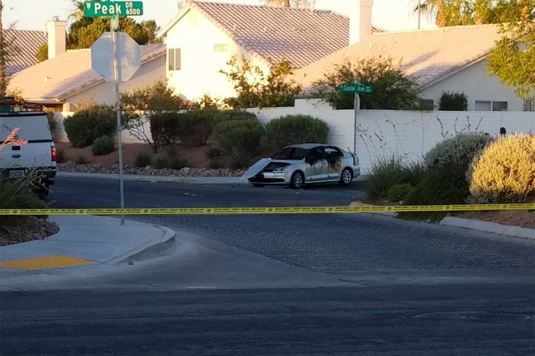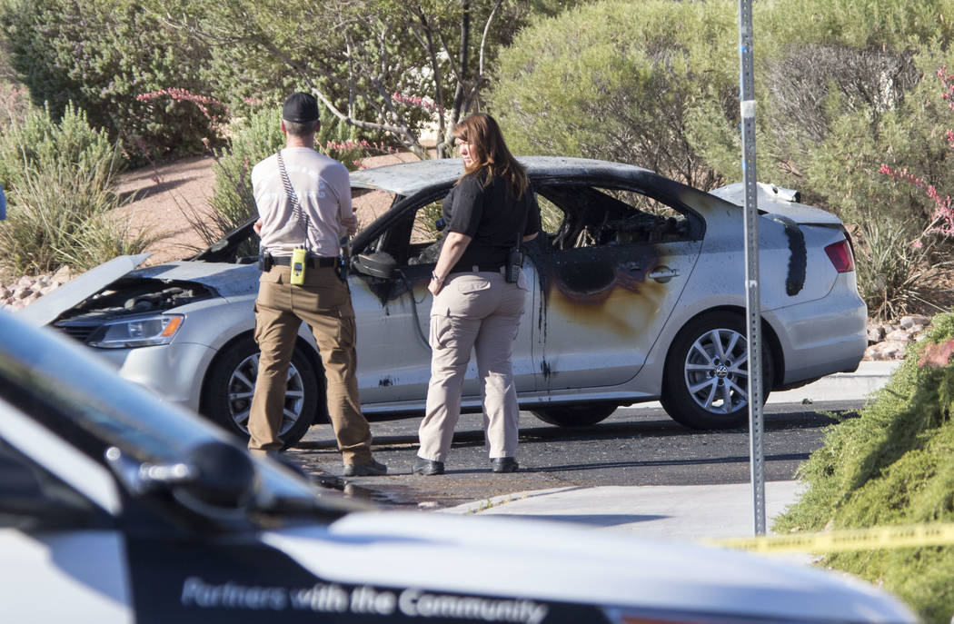 Homicide detectives are investigating after a body was found inside a burning car early Thursday morning, June 22, 2017, at the intersection of Chandler Mews and Castor Tree Way in northwest Las Vegas. (Mike Shoro/Las Vegas Review-Journal)