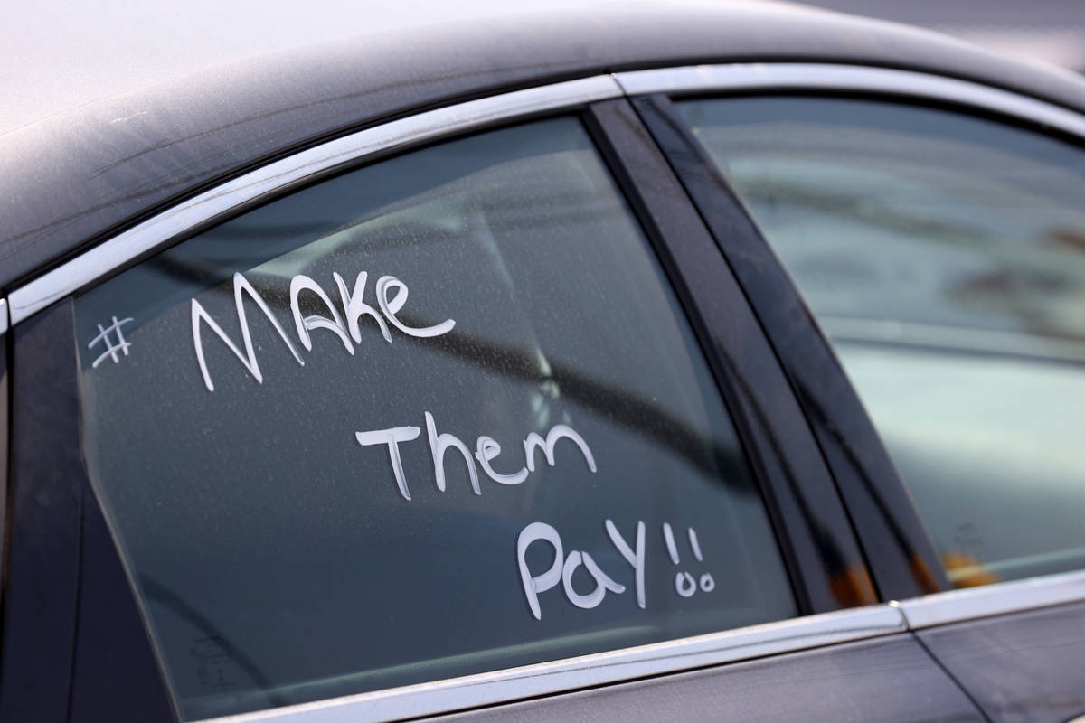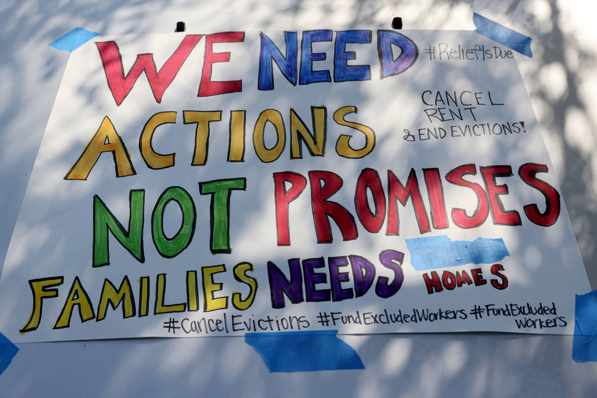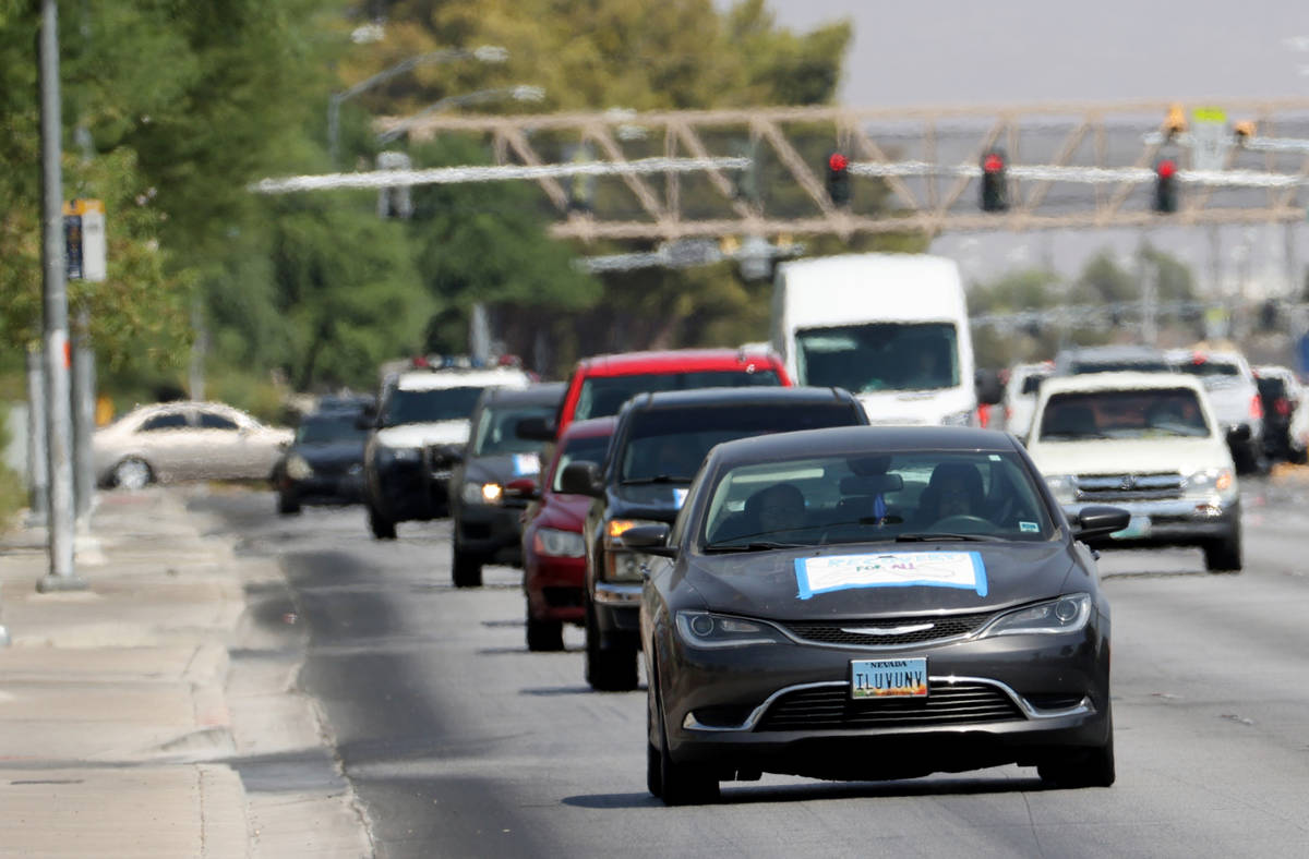 About 20 cars traveled in a caravan around a Las Vegas neighborhood Tuesday to protest the impasse in Washington over relief for those facing evictions and push for federal action.