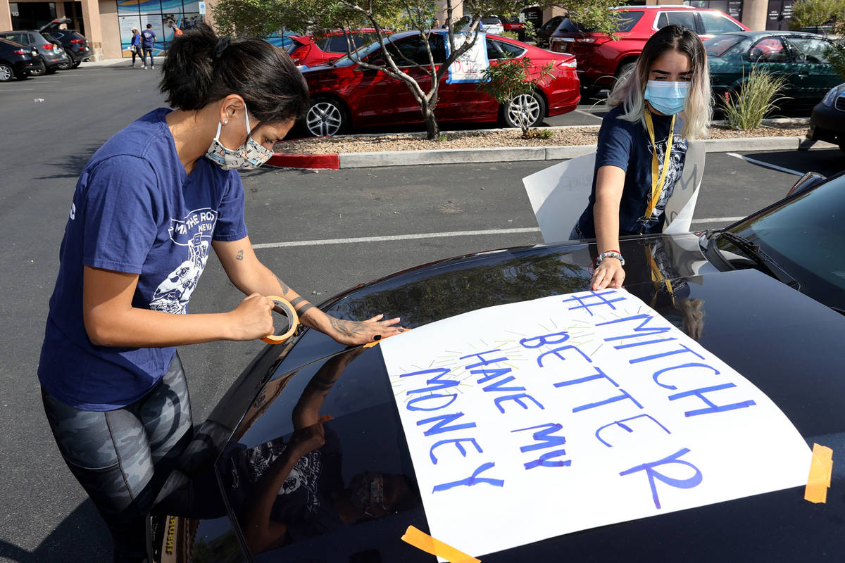 The vehicles, adorned with signs reading, “Mitch Better Have My Money” and “Relief is Due,” embarked on the caravan from outside the nonprofit Make the Road Nevada office, 4250 E. Bonanza Road, and then traveled a roughly 9-mile loop around the area.