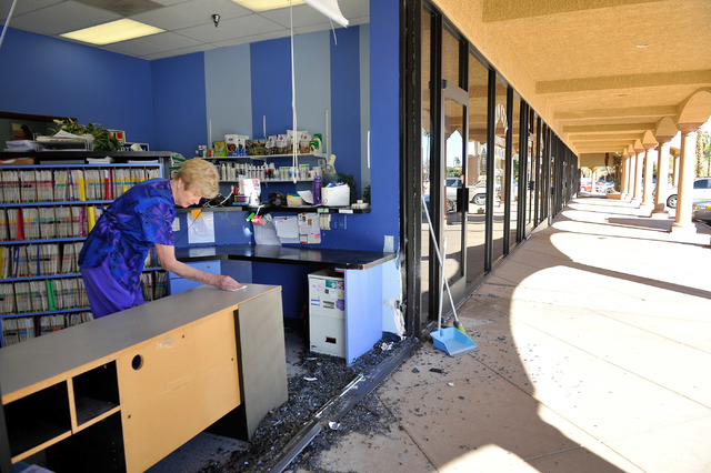 A small Hyundai crashed into the building at 8564 Del Webb Blvd., near Rampart Boulevard, just before noon.