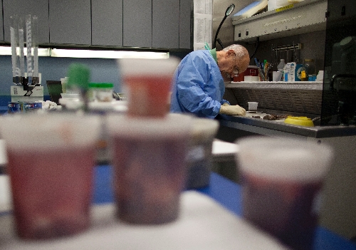 About 14,000 people die each year in and around Las Vegas. The Clark County coroner's office investigates about 3,500 of those deaths and conducts about 1,500 autopsies.