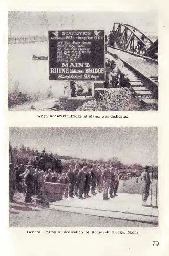 Then in April 1945, the battalion worked with the 347th Engineers to build a single track bridge over the Rhine River at Mainz, Germany. The Roosevelt Bridge, named in honor of the late President Franklin D. Roosevelt, was completed in 9½ days and dedicated in person by Patton, who made the first trip across it with the 718th.